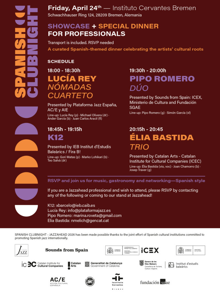 La cita se organiza desde la coordinación de las siguientes instituciones españolas Plataforma Jazz España, AC/E Acción Cultural Española, ICEX Sounds from Spain, ICEC Catalan Arts, IEB Institut D’Estudis Balearics, Instituto Cervantes, AIE, Ministerio de Cultura y la Fundación SGAE junto con jazzahead!. Las actuaciones son: